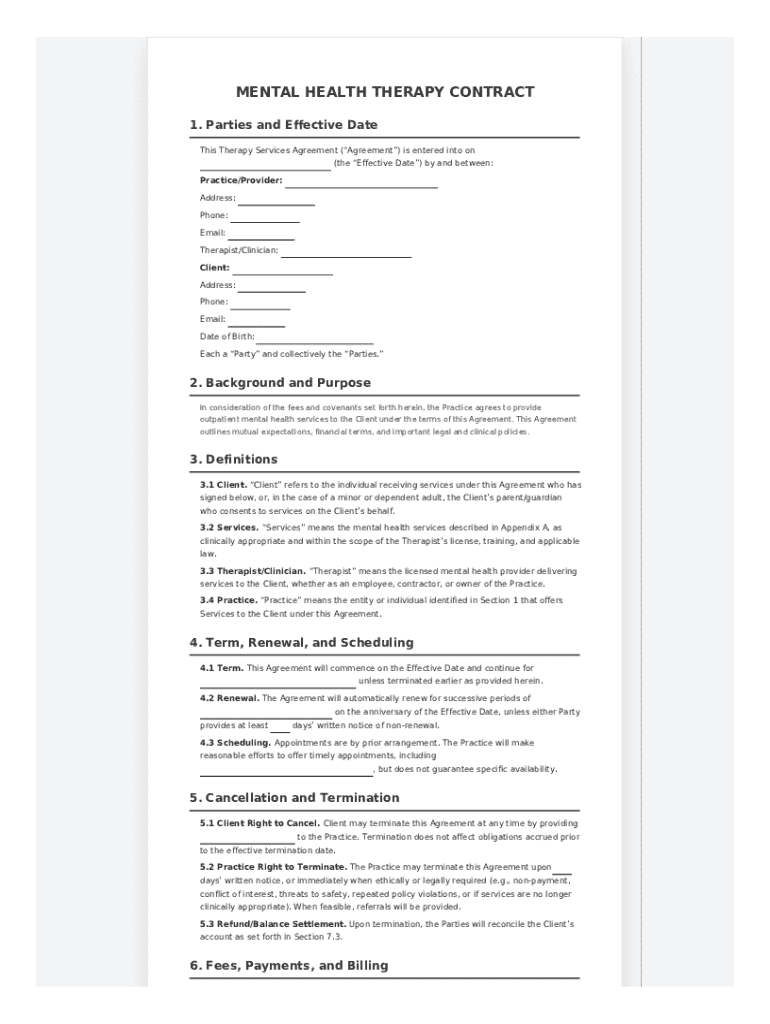 A comprehensive Mental Health Therapy Contract Template should include essential elements such as an overview of the therapeutic services, informed consent statements, confidentiality clauses, and termination policies. It's also important to outline payment terms and what clients should expect during their therapy sessions. Including these components in your Mental Health Therapy Contract Template will create a solid foundation for the therapeutic process.