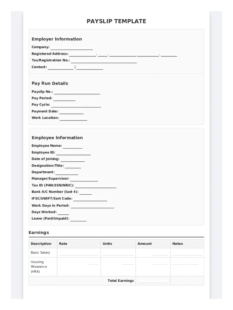 A payslip template is a pre-structured document that outlines an employee's earnings, deductions, and net pay for a specific pay period.