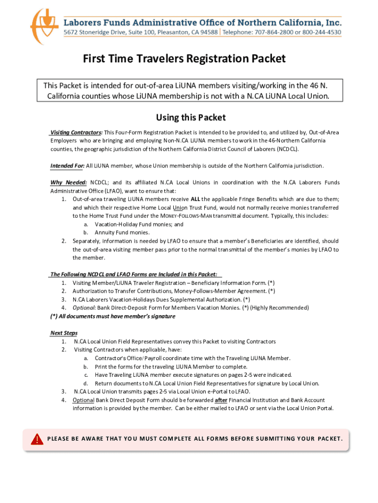 Laborers Funds Administrative Office of Northern California , Inc . 5672 Stoneridge Drive, Suite 100, Pleasanton, CA 94588 [ Telephone: 707864 2800 or 800 244 4530First Time Travelers Registration
