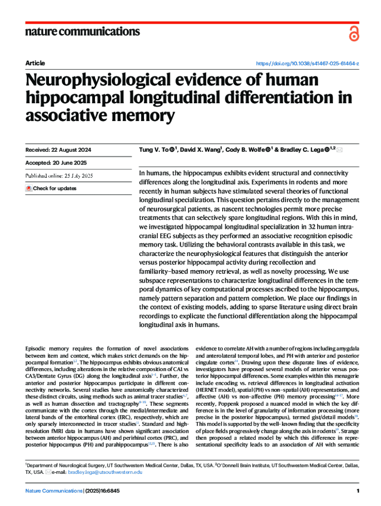 Articlehttps://doi.org/10.1038/s4146702561464zNeurophysiological evidence of human hippocampal longitudinal differentiation in associative memory Received: 22 August 2024Tung V. To1, David X. Wang1,