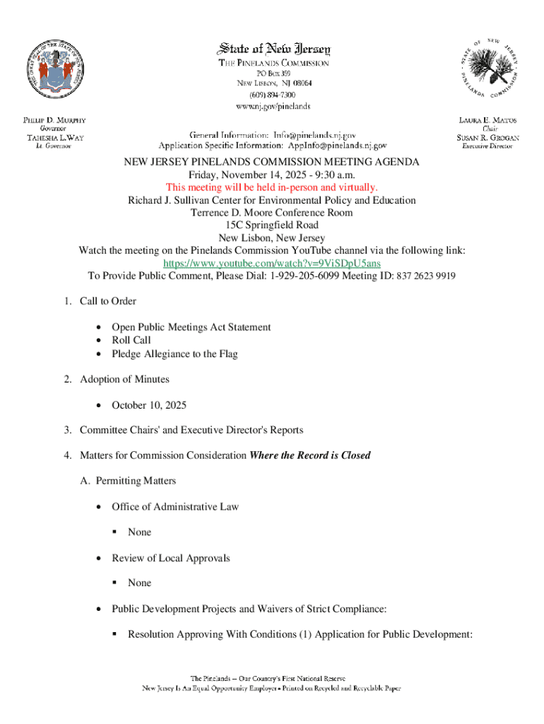 NEW JERSEY PINELANDS COMMISSION MEETING AGENDA Friday, November 14, 20259:30 a.m. This meeting will be held inperson and virtually. Richard J. Sullivan Center for Environmental Policy and Education