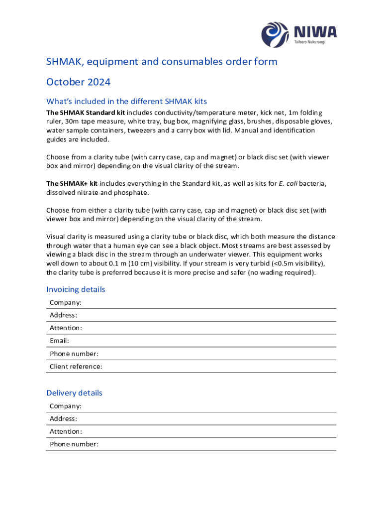 SHMAK, equipment and consumables order form October 2024 Whats included in the different SHMAK kits The SHMAK Standard kit includes conductivity/temperature meter, kick net, 1m folding ruler, 30m