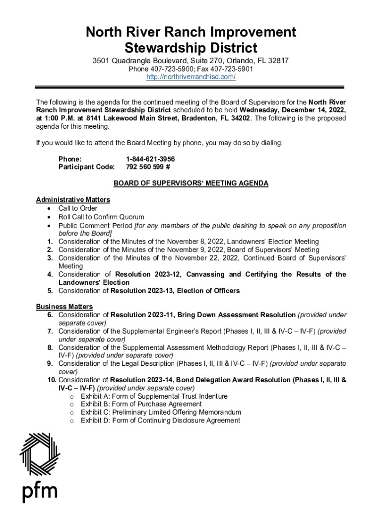 North River Ranch Improvement Stewardship District 3501 Quadrangle Boulevard, Suite 270, Orlando, FL 32817 Phone 4077235900; Fax 4077235901 http://northriverranchisd.com/The following is the agenda
