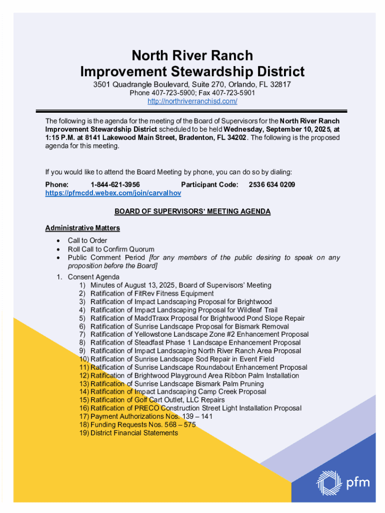 North River Ranch Improvement Stewardship District 3501 Quadrangle Boulevard, Suite 270, Orlando, FL 32817 Phone 4077235900; Fax 4077235901 http://northriverranchisd.com/ The following is the agenda