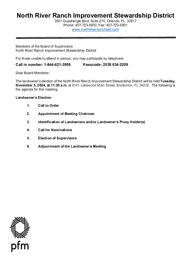 North River Ranch Improvement Stewardship District 3501 Quadrangle Blvd. Suite 270, Orlando, FL 32817 Phone: 4077235900, Fax: 4077235901www.northriverranchisd.comMembers of the Board of Supervisors