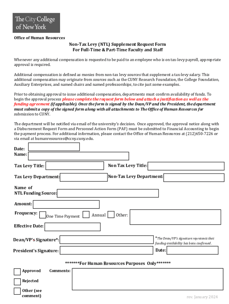 The primary purpose of the non-tax levy NTL supplement form lies in its importance for budgeting and funding. Completing this document properly provides a clear overview of financial needs which heavily influences both short-term and long-term resource allocation. By laying out a structured request, it enables financial teams to prioritize essential programs that may not be funded through regular tax revenues.