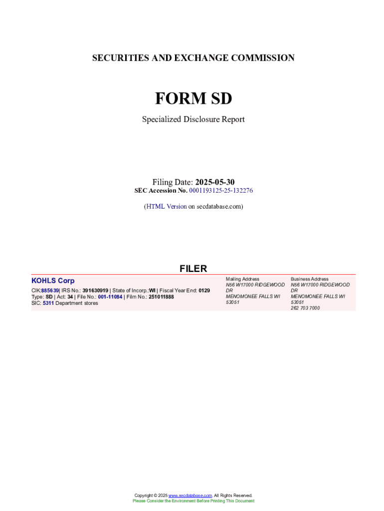 SECURITIES AND EXCHANGE COMMISSIONFORM SD Specialized Disclosure ReportFiling Date: 20250530SEC Accession No. 000119312525132276 (HTML Version on secdatabase.com)FILER KOHLS Corp CIK:885639| IRS No.: