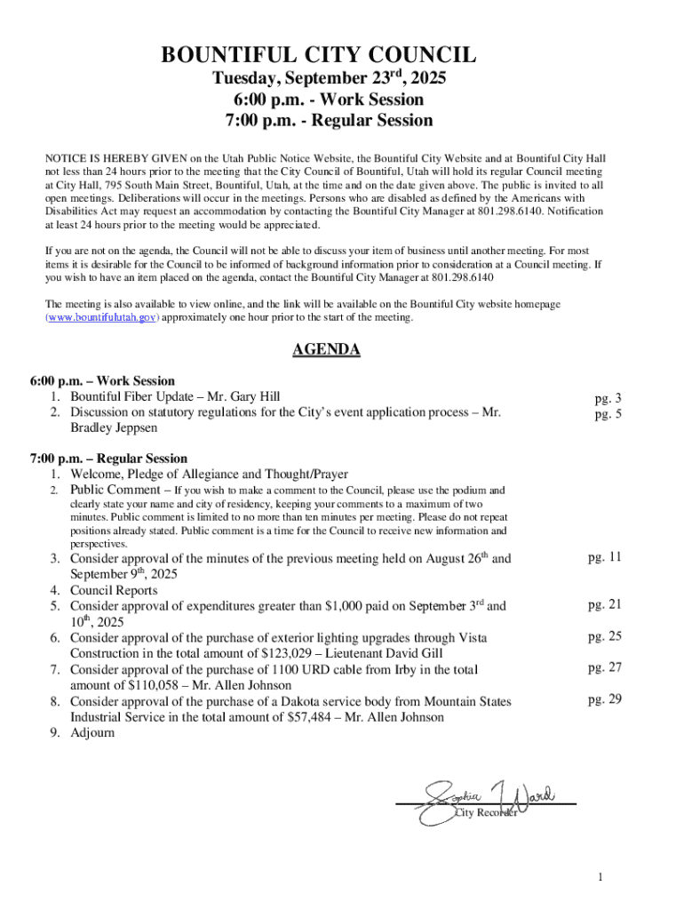BOUNTIFUL CITY COUNCIL Tuesday, September 23rd, 2025 6:00 p.m.Work Session 7:00 p.m.Regular Session NOTICE IS HEREBY GIVEN on the Utah Public Notice Website, the Bountiful City Website and at Bountiful