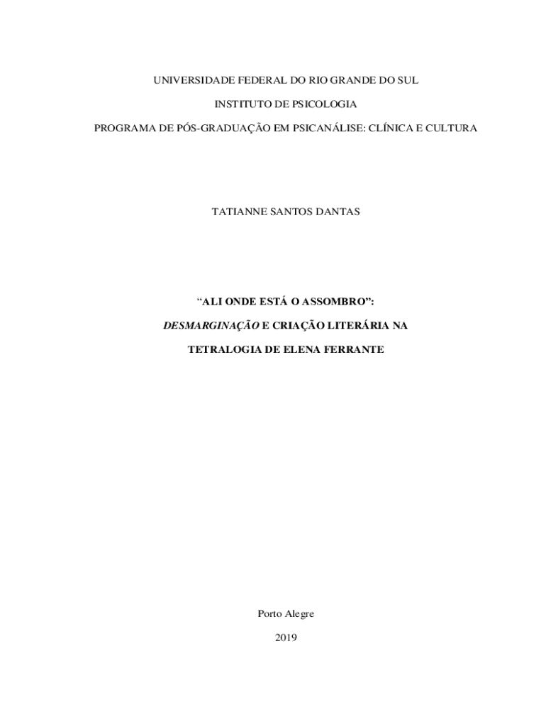 UNIVERSIDADE FEDERAL DO RIO GRANDE DO SUL INSTITUTO DE PSICOLOGIA PROGRAMA DE PSGRADUAO EM PSICANLISE: CLNICA E CULTURATATIANNE SANTOS DANTASALI ONDE EST O ASSOMBRO: DESMARGINAO E CRIAO LITERRIA NA
