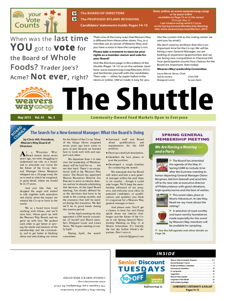 Vote online at www.weaversway.coop The BOARD OF DIRECTORSThe PROPOSED BYLAWS REVISIONS Candidates statements inside: Pages 1415When was the last timeYOU got to vote forthe Board of WholeFoods? Trader