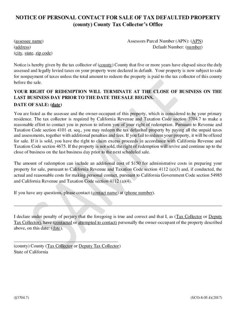 NOTICE OF PERSONAL CONTACT FOR SALE OF TAX DEFAULTED PROPERTY (county) County Tax Collectors Office (assessee name) (address) (city, state, zip code)Assessors Parcel Number (APN): (APN) Default Number: