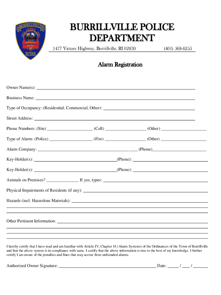 BURRILLVILLE POLICE DEPARTMENT 1477 Victory Highway, Burrillville, RI 02830(401) 5686255Alarm RegistrationOwner Name(s): Business Name: Type of Occupancy: (Residential, Commercial, Other): Street