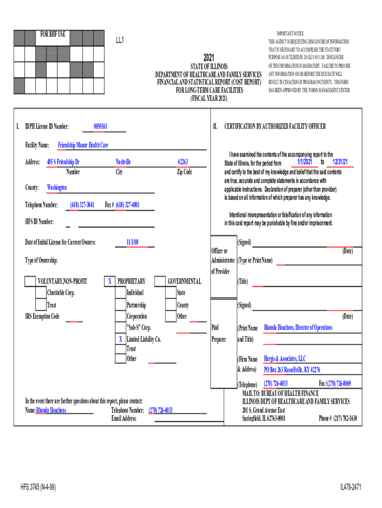 FOR BHF USELL1 2021STATE OF ILLINOIS DEPARTMENT OF HEALTHCARE AND FAMILY SERVICES FINANCIAL AND STATISTICAL REPORT (COST REPORT) FOR LONGTERM CARE FACILITIES (FISCAL YEAR 2021) I.IDPH License ID Number: