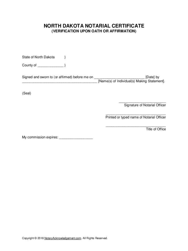 North Dakota offers a variety of official forms specific to notary certificates. Some of the essential forms include the acknowledgment form, jurat form, and copy certification form. Each of these serves distinct scenarios, such as certifying the signing of legal documents or authenticating copies of records, vital for many legal proceedings and documentation.