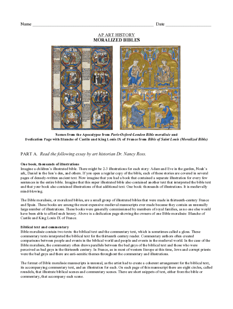 Name ___ Date ___ AP ART HISTORY MORALIZED BIBLESScenes from the Apocalypse from ParisOxfordLondon Bible moralise and Dedication Page with Blanche of Castile and King Louis IX of France from Bible