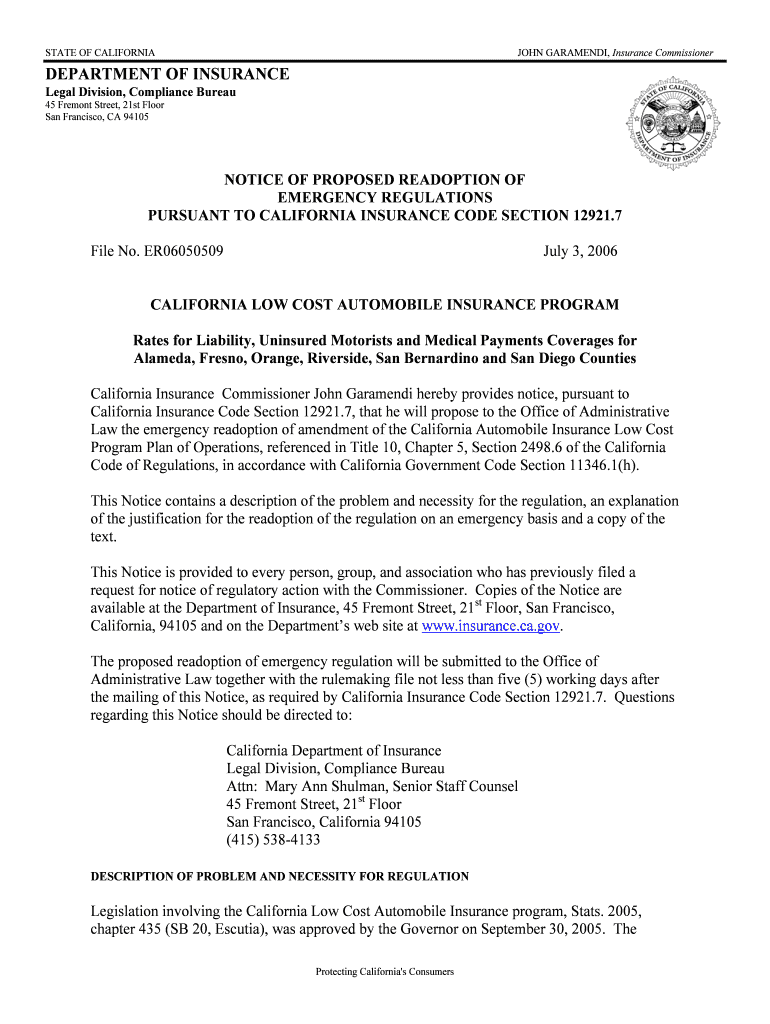 STATE OF CALIFORNIA JOHN GARMENT, Insurance Commissioner DEPARTMENT OF INSURANCE Legal Division, Compliance Bureau 45 Fremont Street, 21st Floor San Francisco, CA 94105 NOTICE OF PROPOSED READOPTION