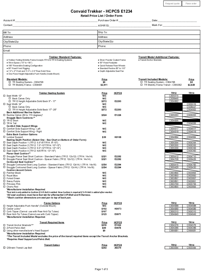 Request quotePlace orderConvaid TrekkerHCPCS E1234 Retail Price List / Order Form Account #:___ Purchase Order #:___ Date:___ Contact:___ ATP/RTS:___ Mark For:___ Bill To:Ship To:Address:Address:City/State/Zip:City/State/Zip:Phone:Phone:Email: