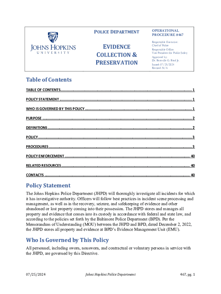 POLICE DEPARTMENTEVIDENCECOLLECTION & PRESERVATIONOPERATIONAL PROCEDURE #467 Responsible Executive: Chief of Police Responsible Office: Vice President for Public Safety Approved by: Dr. Branville