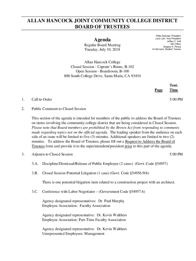ALLAN HANCOCK JOINT COMMUNITY COLLEGE DISTRICT BOARD OF TRUSTEES Agenda Regular Board Meeting Tuesday, July 10, 2018Hilda Zacaras, President Larry Lahr, Vice President Jeffery C. Hall Dan Hilker Gregory