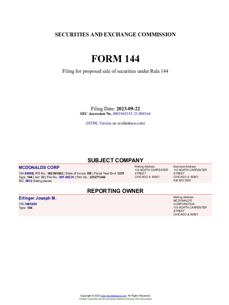 Get the free Notice of Proposed Sale of Securities (Form 144)