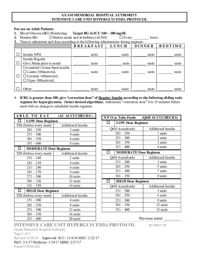 GUAM MEMORIAL HOSPITAL AUTHORITY INTENSIVE CARE UNIT HYPERGLYCEMIA PROTOCOL For use on Adult Patients: 1. Blood Glucose (BG) Monitoring: Target BG in ICU 140180 mg/dL 2. Monitor BG:Before meals and