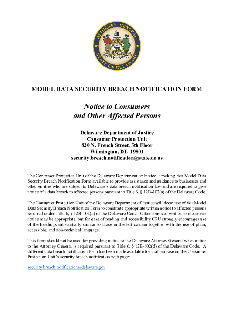 Get the free Security Breach Notice to the Delaware Attorney General - attorneygeneral delaware