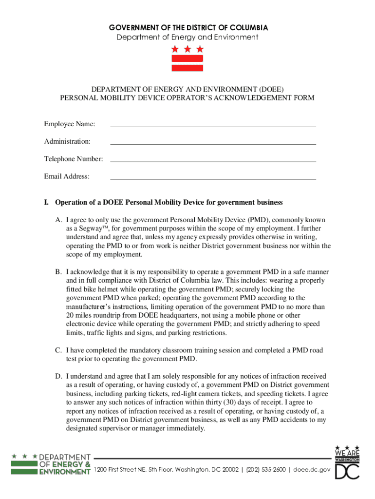 GOVERNMENT OF THE DISTRICT OF COLUMBIA Department of Energy and EnvironmentDEPARTMENT OF ENERGY AND ENVIRONMENT (DOEE) PERSONAL MOBILITY DEVICE OPERATORS ACKNOWLEDGEMENT FORMEmployee Name:___Administration:___Telephone