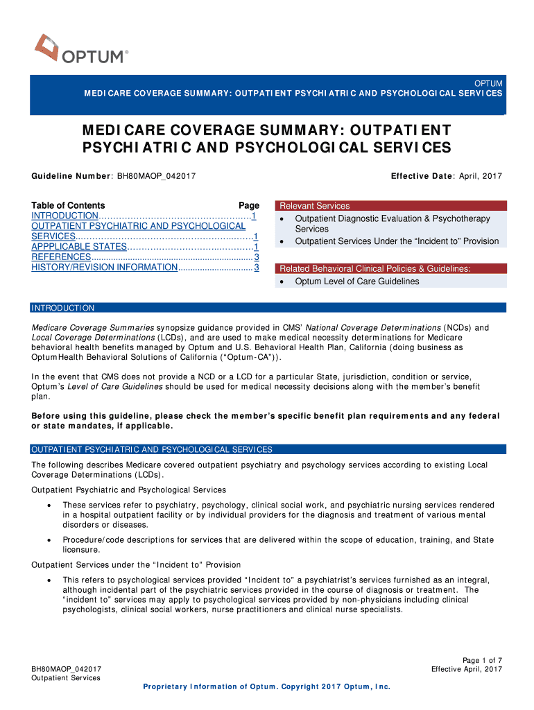 MEDICARE COVERAGE SUMMARY: OUTPATIENT PSYCHIATRIC AND PSYCHOLOGICAL SERVICESMEDICARE COVERAGE SUMMARY: OUTPATIENT