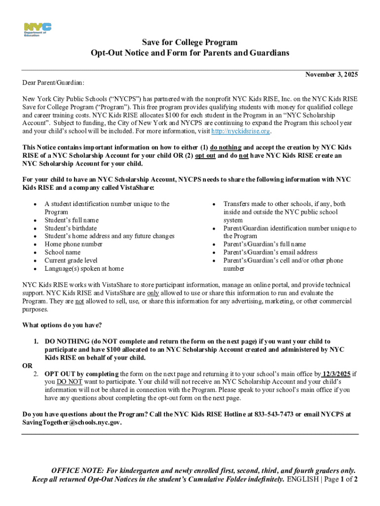 Get the free Save for College Program Opt-Out Notice and Form for Parents and ...