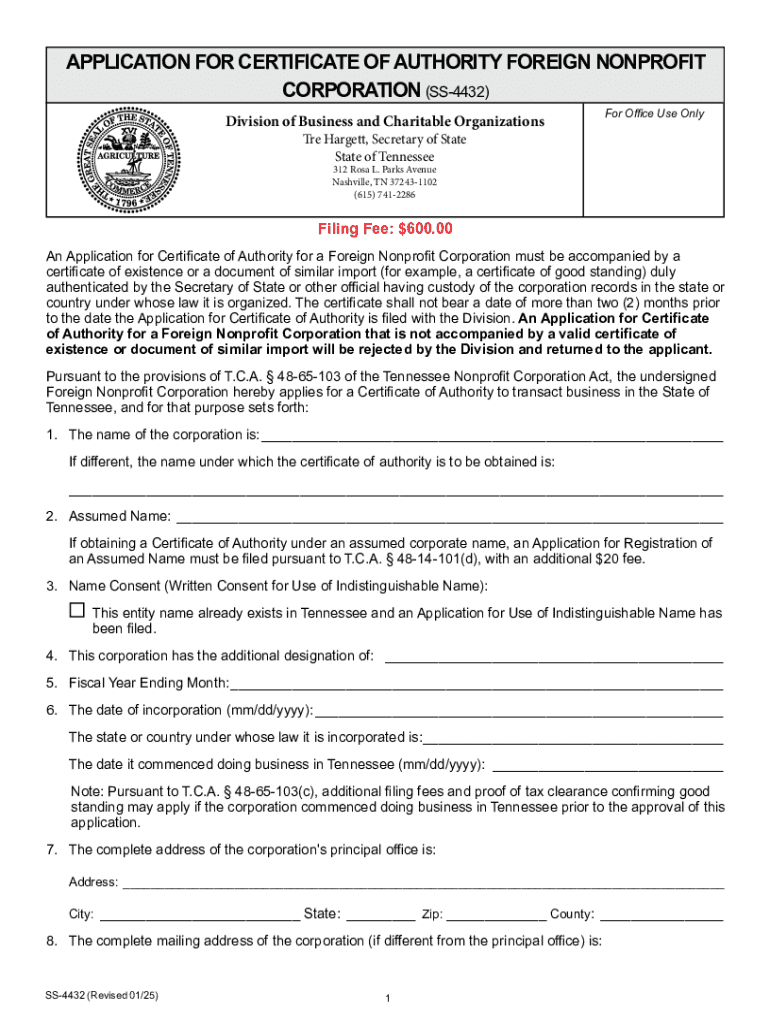 APPLICATION FOR CERTIFICATE OF AUTHORITY FOREIGN NONPROFIT CORPORATION (SS4432) Division of Business and Charitable OrganizationsFor Office Use OnlyTre Hargett, Secretary of State State of Tennessee