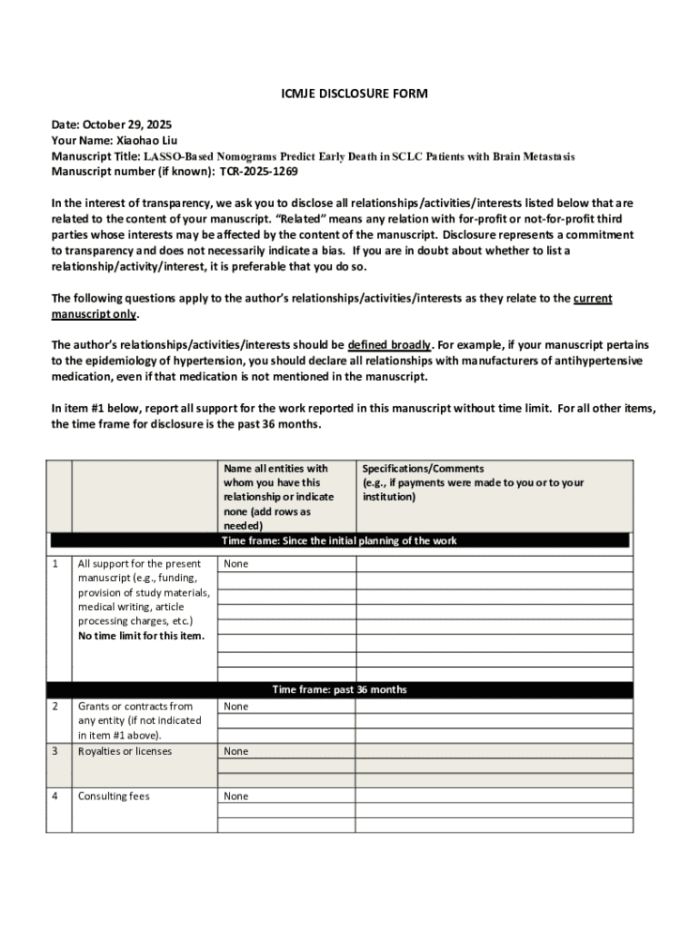 ICMJE DISCLOSURE FORM Date: October 29, 2025 Your Name: Xiaohao Liu Manuscript Title: LASSOBased Nomograms Predict Early Death in SCLC Patients with Brain Metastasis Manuscript number (if known):