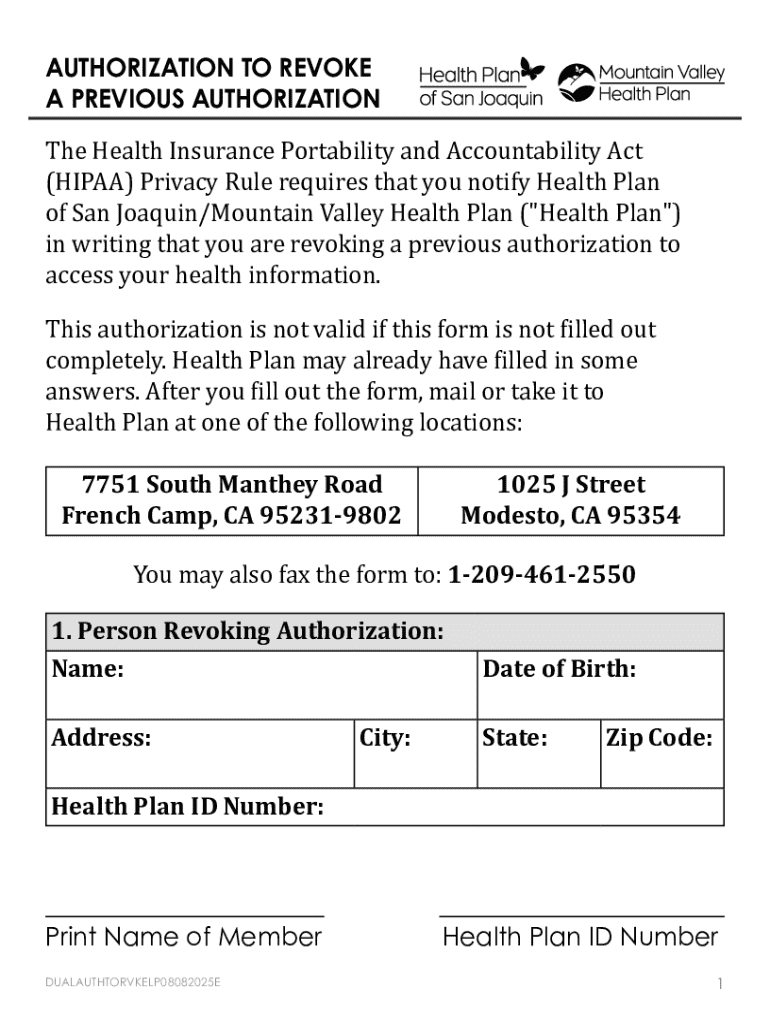 AUTHORIZATION TO REVOKE A PREVIOUS AUTHORIZATION The Health Insurance Portability and Accountability Act (HIPAA) Privacy Rule requires that you notify Health Plan of San Joaquin/Mountain Valley Health