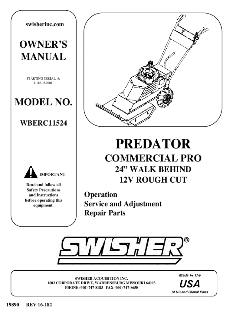 swisherinc.comOWNERS MANUAL STARTING SERIAL #: L116182001MODEL NO. WBERC11524PREDATOR COMMERCIAL PRO IMPORTANT Read and follow all Safety Precautions and Instructions before operating this equipment.24