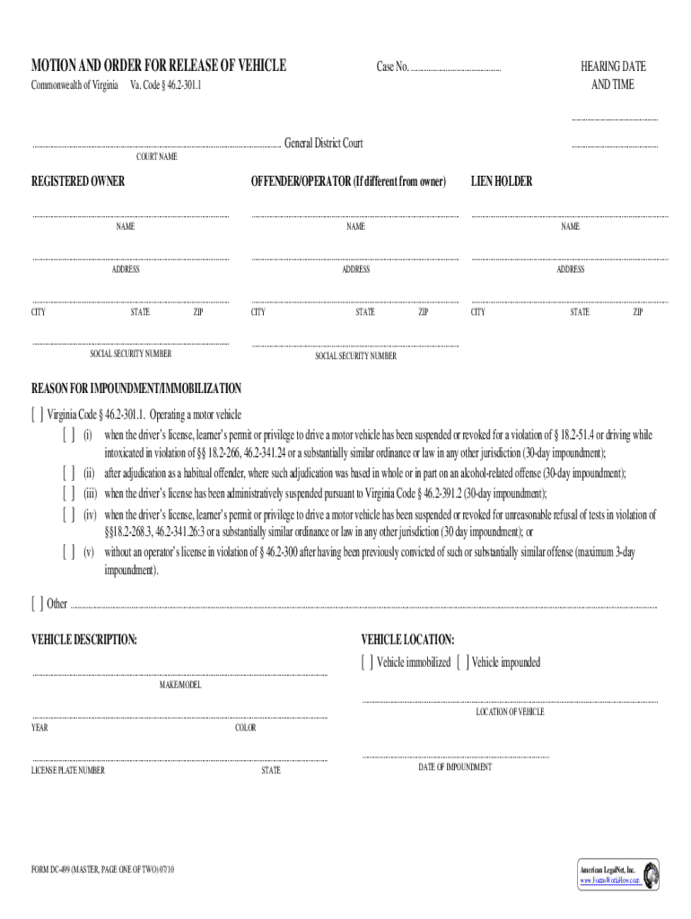 Get the free Motion And Order For Release Of Vehicle :: Virginia :: Civil : ...