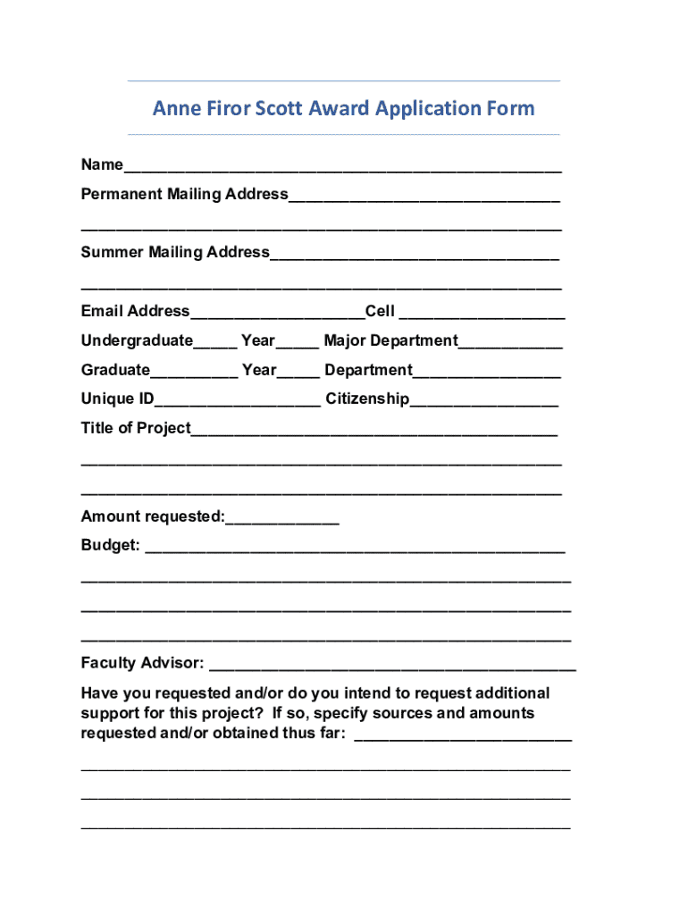 Anne Firor Scott Award Application Form Name___ Permanent Mailing Address___ ___ Summer Mailing Address___ ___ Email Address___Cell ___ Undergraduate___ Year___ Major Department___ Graduate___ Year___