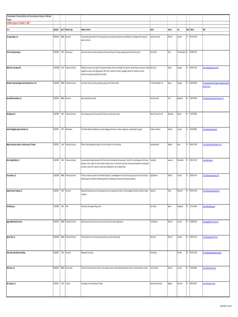 Commonwealth of Kentucky Minority and Women Business Enterprise Certification Program Certified Listing as of October 31, 2025 NameExpirationType (*) Business TypeProduct or ServiceOwnerCountyCityState