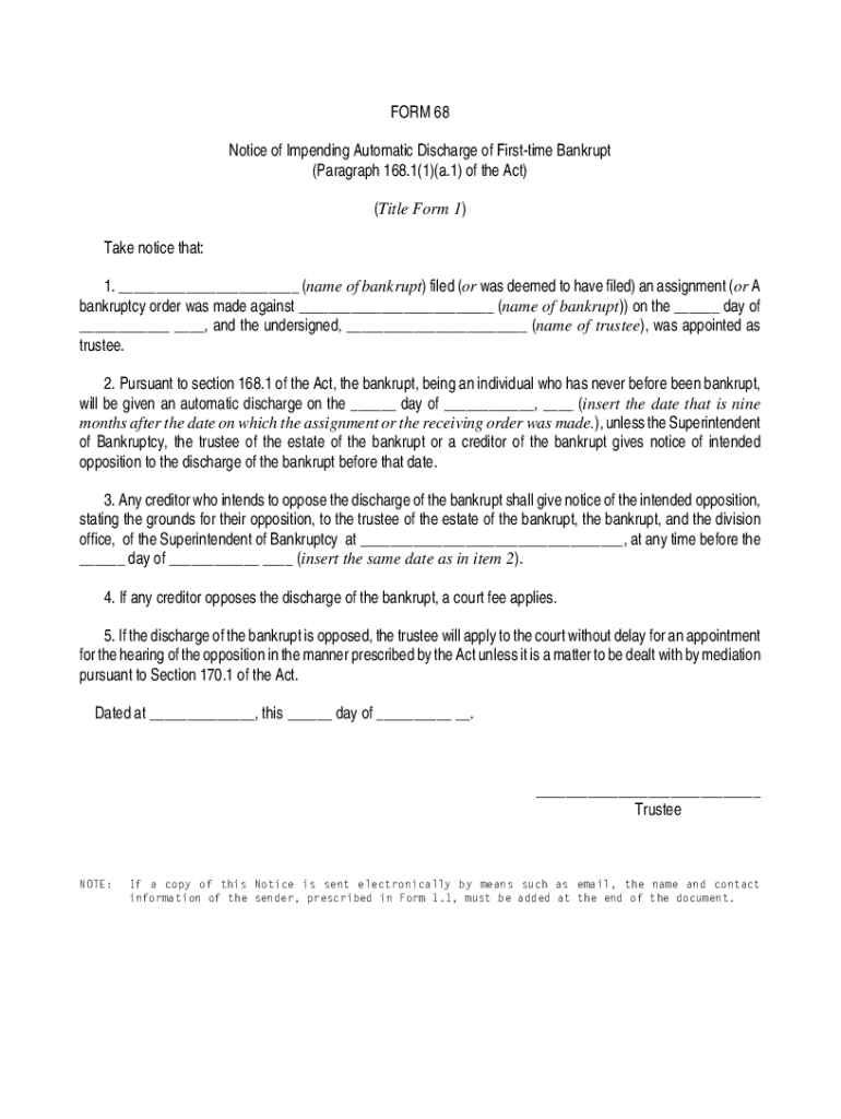 Form 68 specifically applies to first-time bankrupt individuals, who are typically eligible for an automatic discharge after a designated period, provided they meet certain conditions. Understanding the context surrounding Form 68 is crucial as it is tied to federal bankruptcy laws that govern the process. The Bankruptcy and Insolvency Act outlines the obligations and rights of all parties involved, detailing the steps leading to the automatic discharge process.