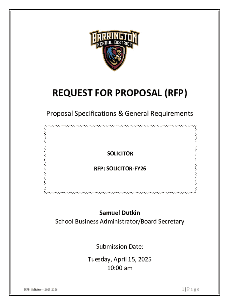 REQUEST FOR PROPOSAL (RFP) Proposal Specifications & General RequirementsSOLICITOR RFP: SOLICITORFY26Samuel Dutkin School Business Administrator/Board Secretary Submission Date: Tuesday, April 15,