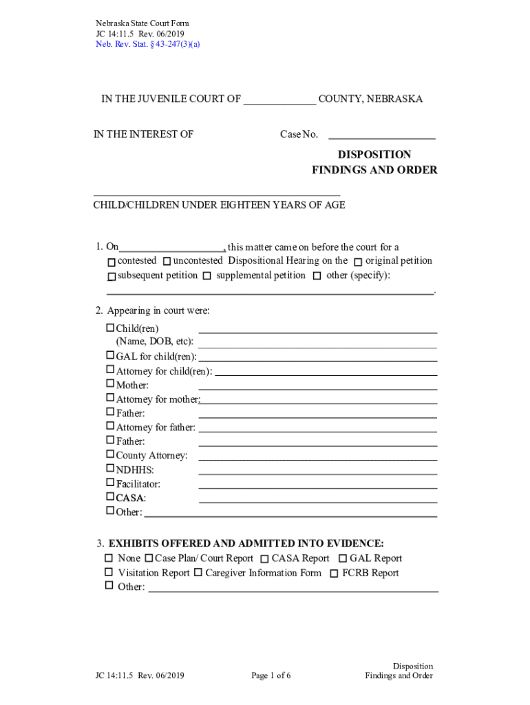 Nebraska State Court Form JC 14:11.5 Rev. 06/2019 Neb. Rev. Stat.43247(3)(a)IN THE JUVENILE COURT OF ___ COUNTY, NEBRASKA Choose the countyIN THE INTEREST OFCase No.DISPOSITION FINDINGS AND ORDER