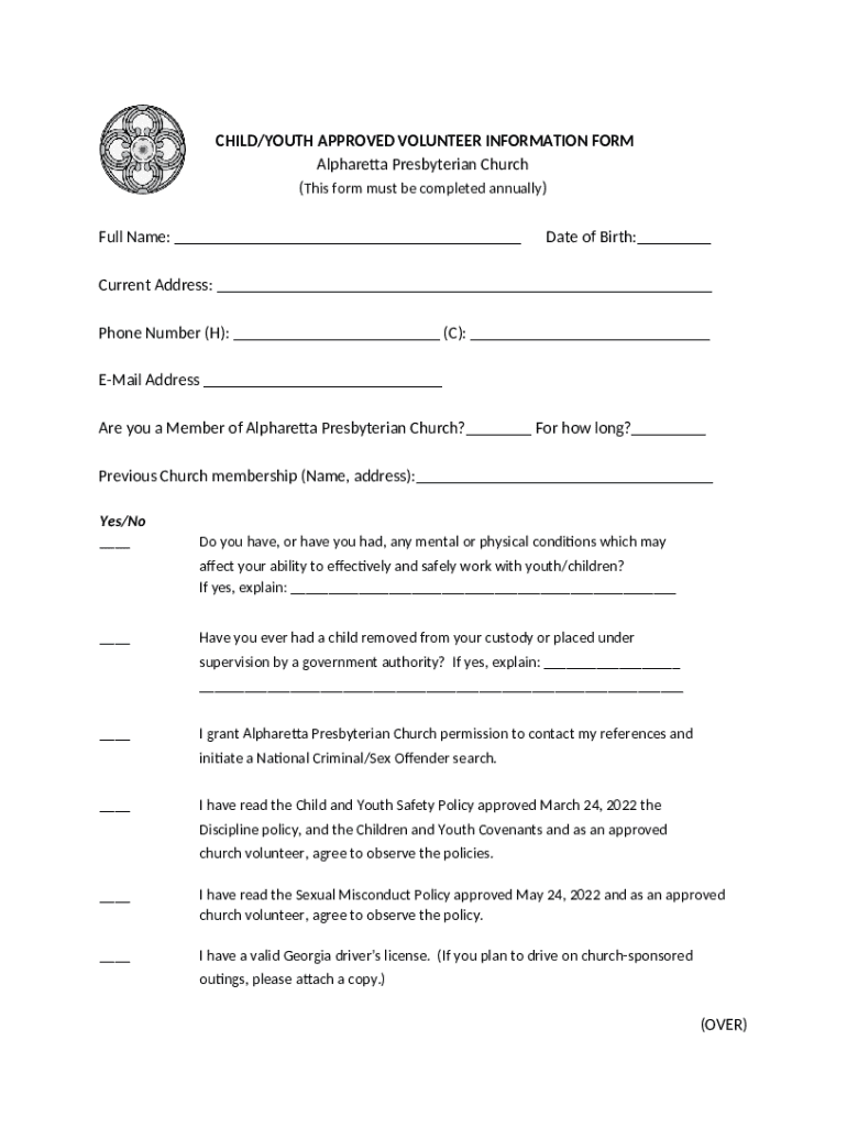 Template Child and Youth Approved Volunteer Ination Paper instructions