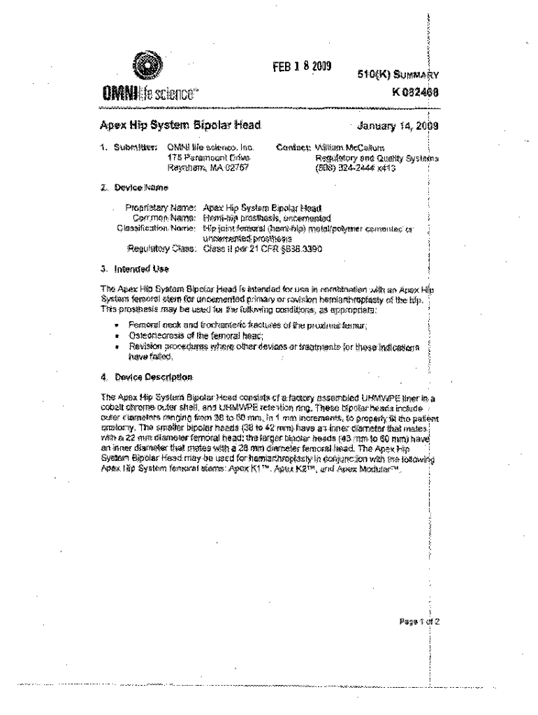 FEB 1 8 2009540oK) SUMMARYK 0824,68 OMNIhiescienceOMNIifApex Hip System Bipolar Head I. SubttTu\'OMNI4l kite sctemo, lc. 175 Paramount DdiveRaynham, MA O276January 44, 2009 Contact Wlfiam McCalurn