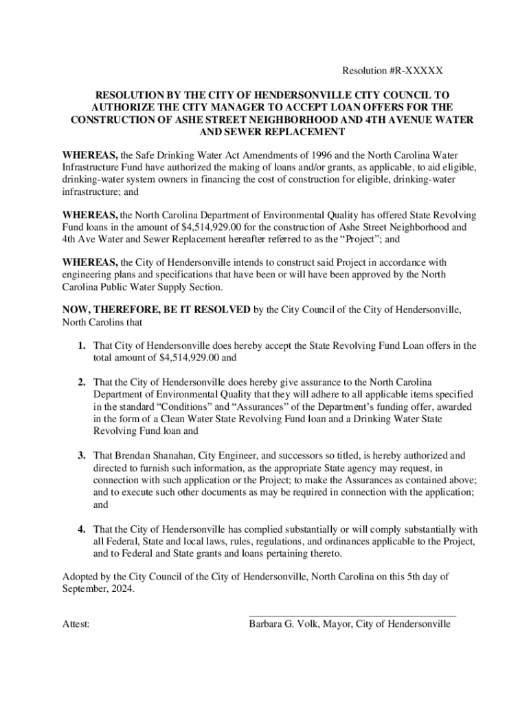 Resolution #RXXXXX RESOLUTION BY THE CITY OF HENDERSONVILLE CITY COUNCIL TO AUTHORIZE THE CITY MANAGER TO ACCEPT LOAN OFFERS FOR THE CONSTRUCTION OF ASHE STREET NEIGHBORHOOD AND 4TH AVENUE WATER AND