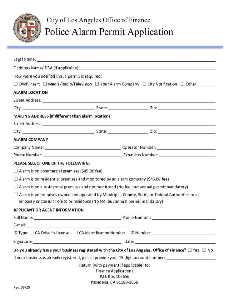 City of Los Angeles Office of FinancePolice Alarm Permit Application Legal Name: Fictitious Name/ DBA (if applicable): How were you notified that a permit is required:DWP InsertMedia/Radio/TelevisionYour
