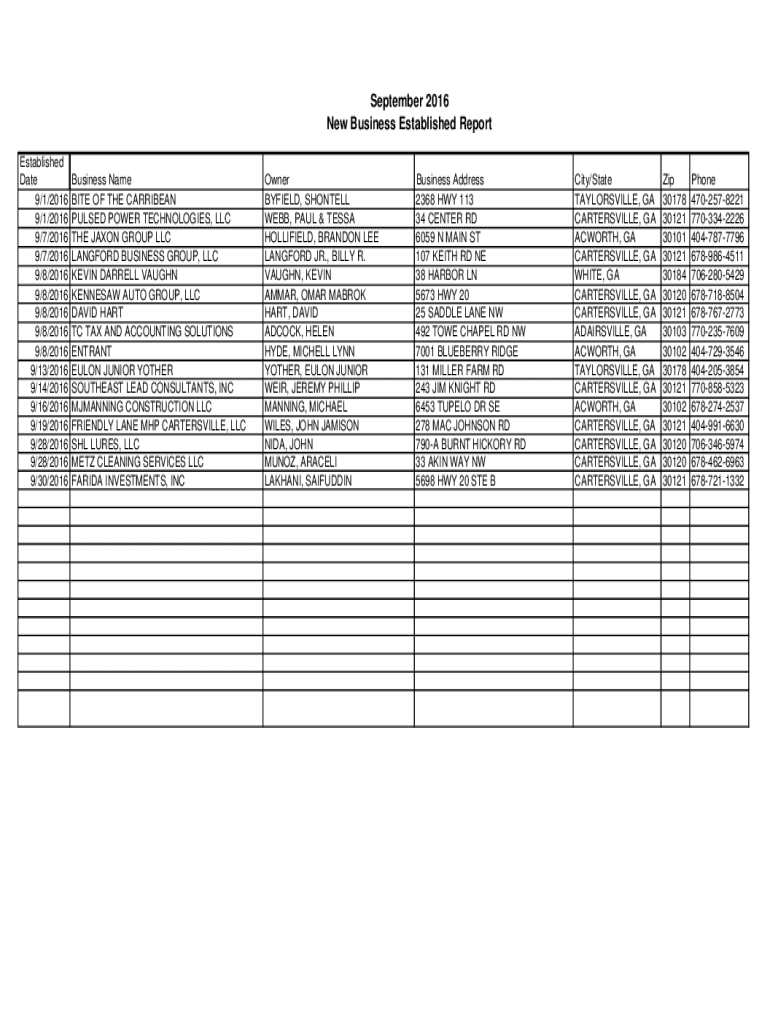 September 2016 New Business Established Report Established Date Business Name 9/1/2016 BITE OF THE CARRIBEAN 9/1/2016 PULSED POWER TECHNOLOGIES, LLC 9/7/2016 THE JAXON GROUP LLC 9/7/2016 LANGFORD
