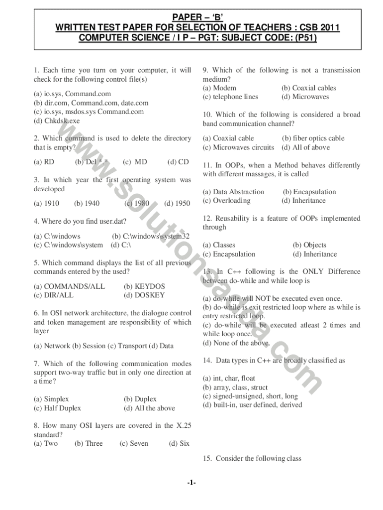 Get the free Paper - B' Written Test Paper For Selection of Teachers: CSB ...