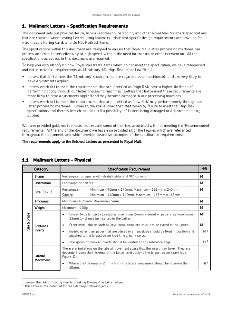 Mailmark Mailing Requirements for Letters1. Mailmark LettersSpecification Requirements The document sets out physical design, Indicia, addressing, barcoding, and other Royal Mail Mailmark specifications