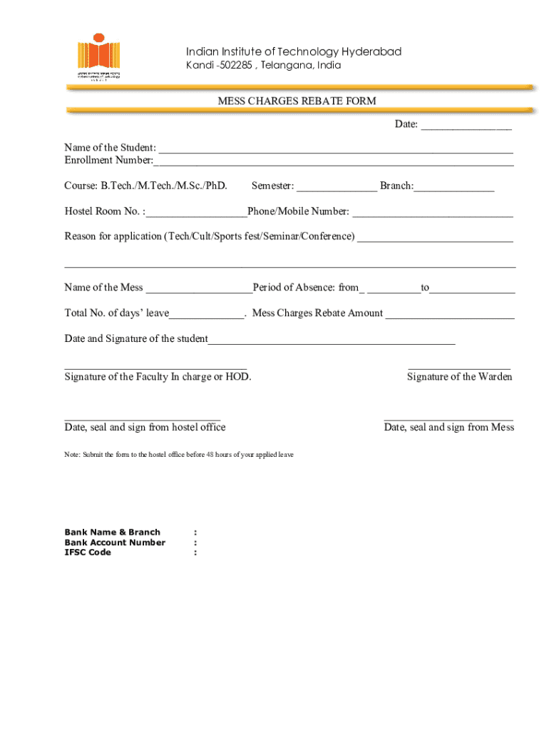 The Mess Charges Rebate Form is crucial for individuals seeking to recover fees associated with their meal services. It ensures transparency and provides a systematic approach for students and residents who have paid these charges yet feel eligible for a rebate based on specific criteria.