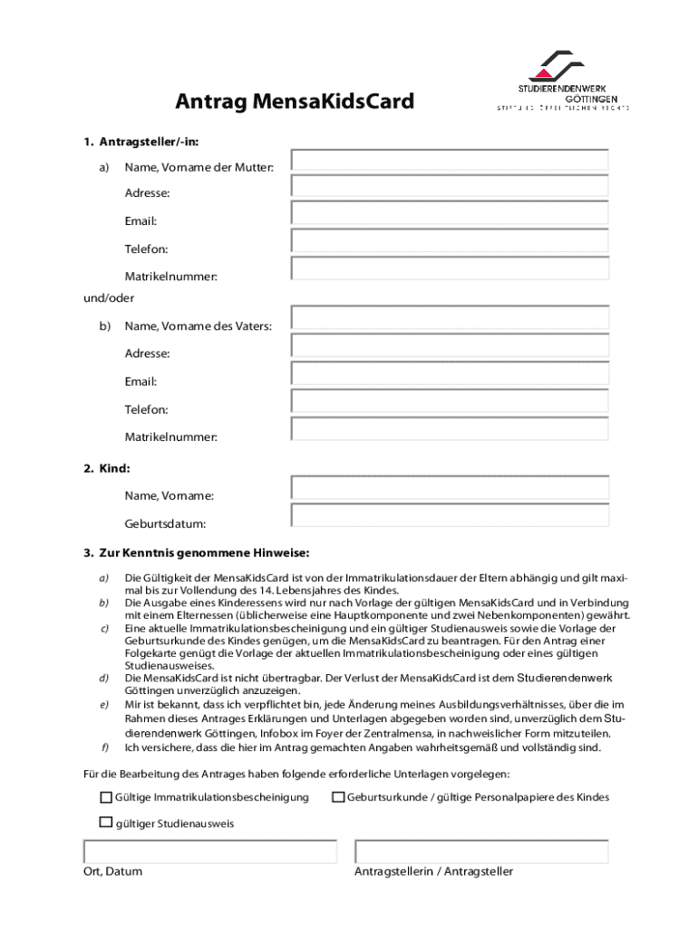 Die mensakidscard kann ausgefüllt werden, indem die erforderlichen persönlichen Informationen wie Name, Geburtsdatum und eventuell die Schule des Kindes eingetragen werden.