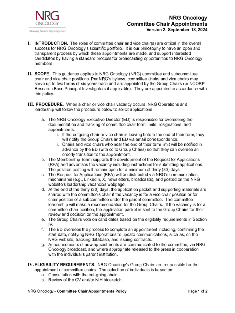 NRG Oncology Committee Chair Appointments Version 2: September 18, 2024I. INTRODUCTION. The roles of committee chair and vice chair(s) are critical in the overall success for NRG Oncologys scientific