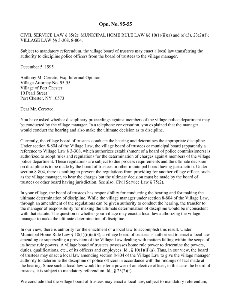 OPINIONS OF THE ATTORNEY GENERAL Page 1 of 2 On. No. 9555 CIVIL SERVICE LAW 85(2); MUNICIPAL HOME RULE LAW 10(1)(ii)(a) and (e)(3), 23(2)(f); VILLAGE LAW 3308, 8804. Subject to mandatory referendum,